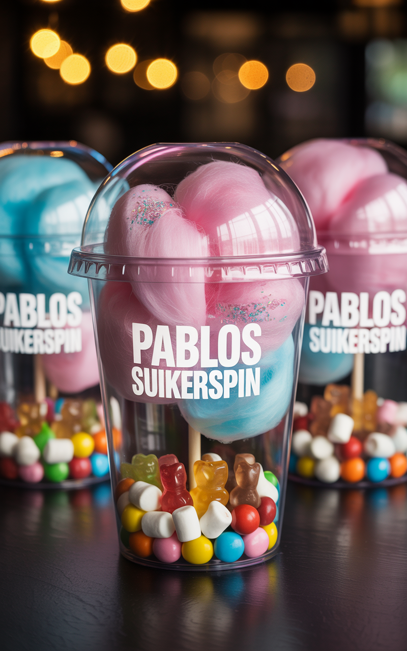 Onze suikerspin wordt geserveerd in luxe bekertjes met onderin kleurrijke snoepjes en bovenop een royale wolk roze of blauwe suikerspin. Voor een extra feestelijk tintje voegen we eetbare glitter toe, glow-in-the-dark details of een verrassende presentatie met fruit en vrolijke kleuren. Zo wordt de suikerspin niet alleen een lekkernij, maar ook een echte eyecatcher die perfect past bij de aankleding van je feest.